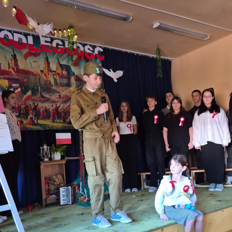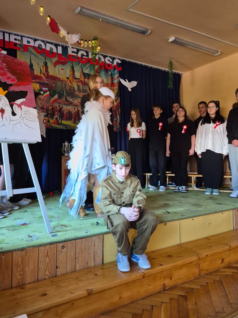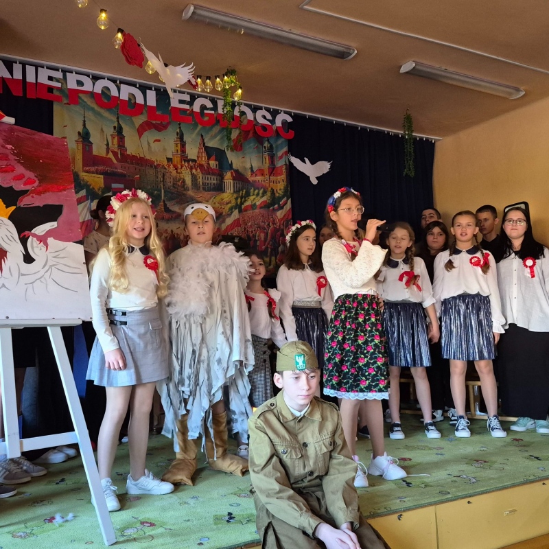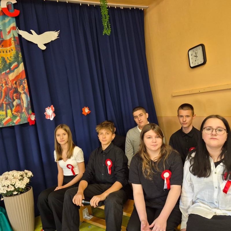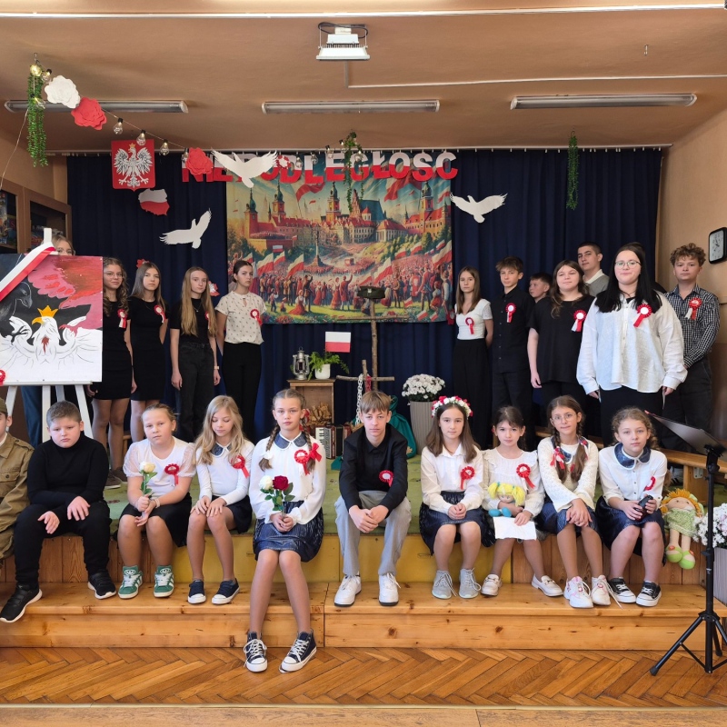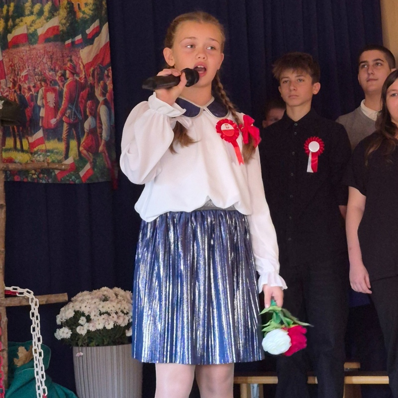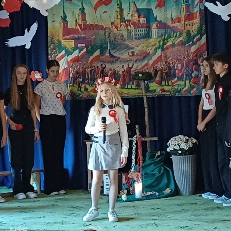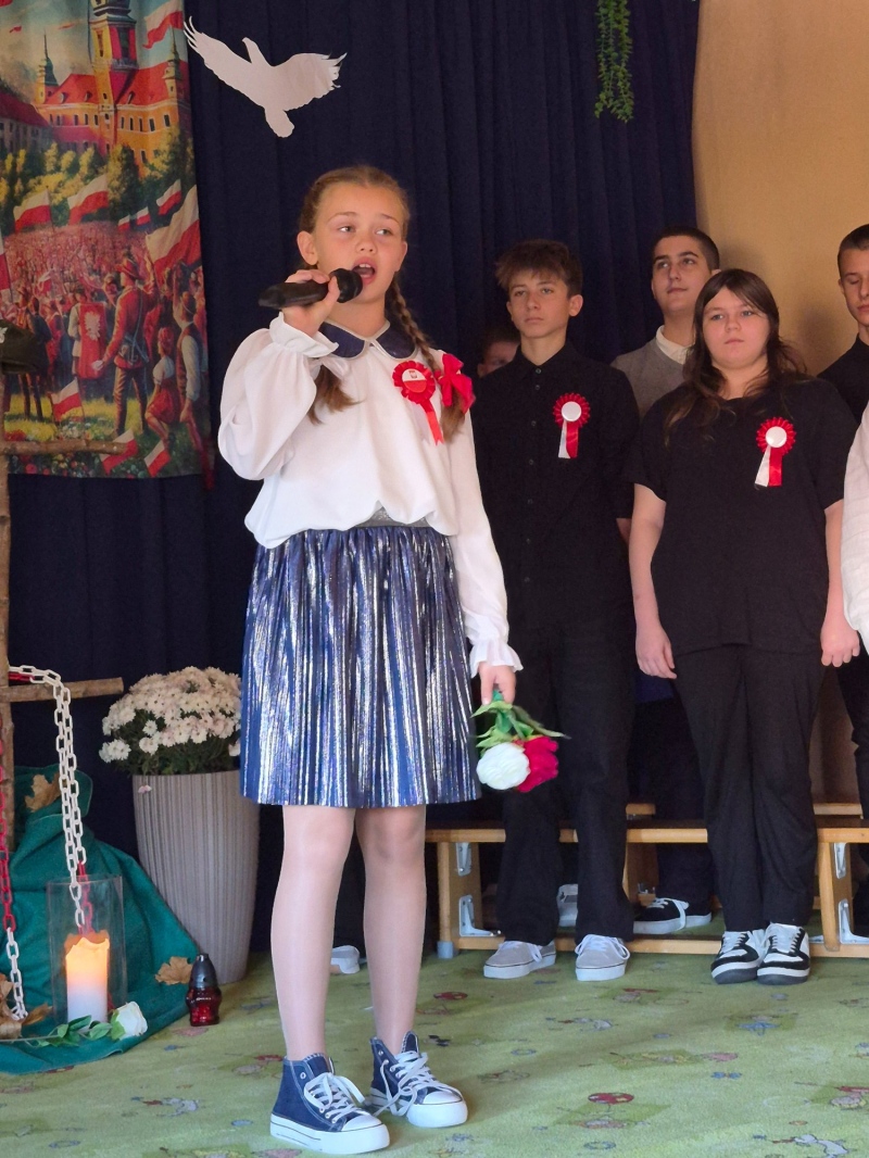 Z okazji Narodowego Święta Niepodległości pani Bernaś wraz z uczniami klasy siódmej oraz solistkami chóru Perfectum przygotowała piękną i wzruszającą akademię.