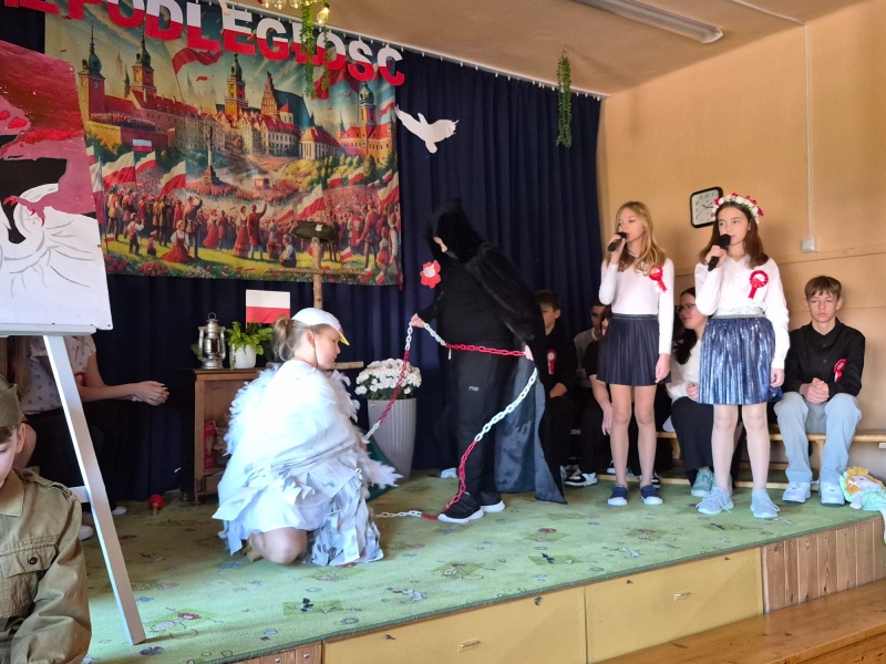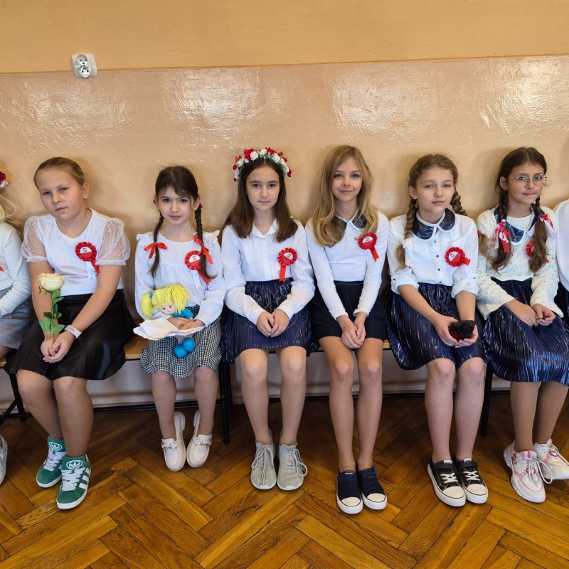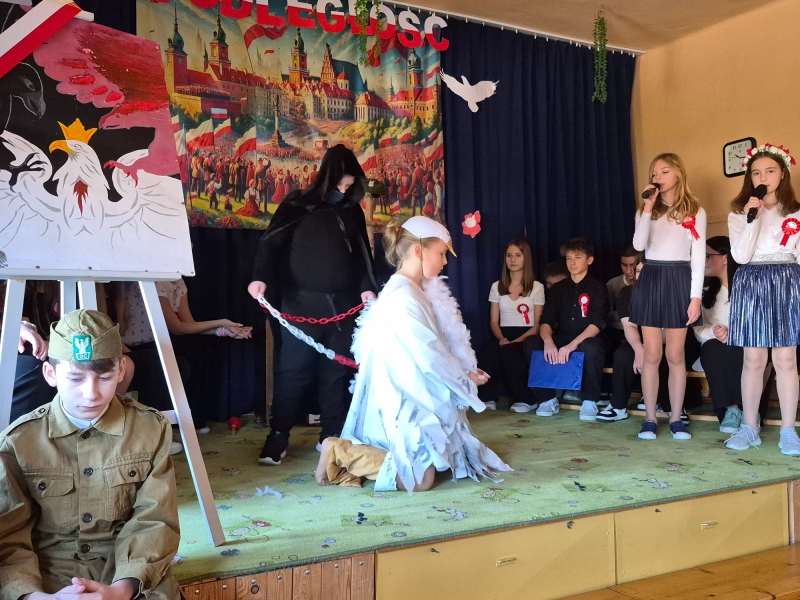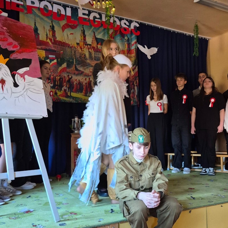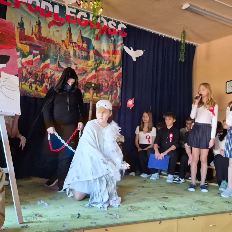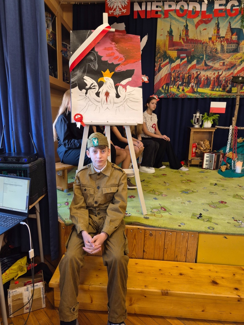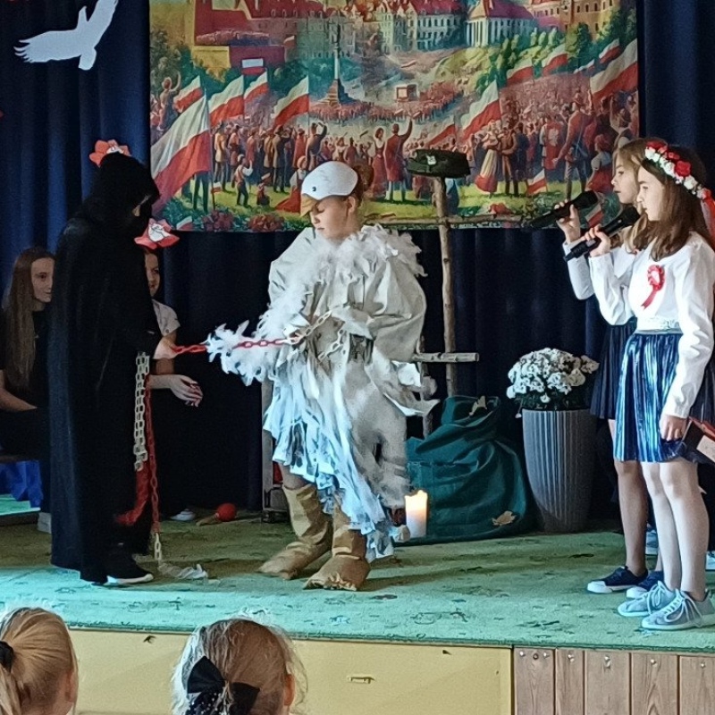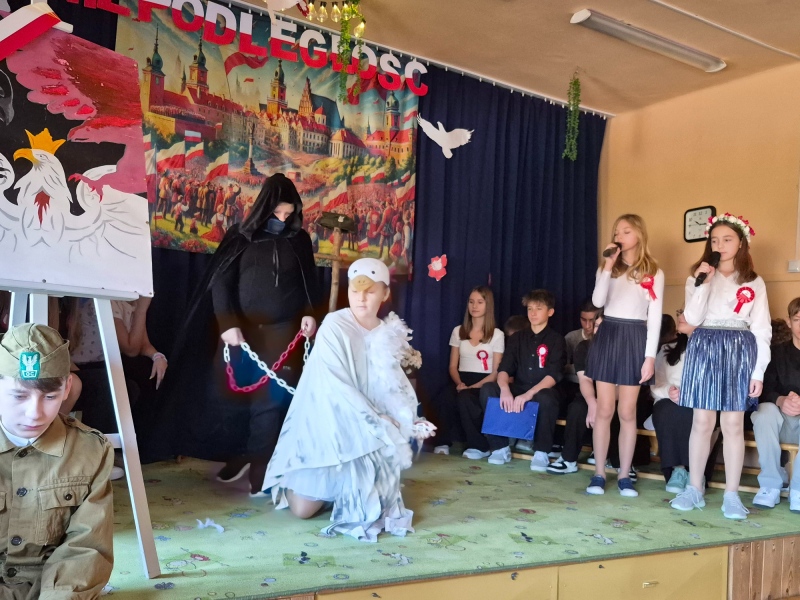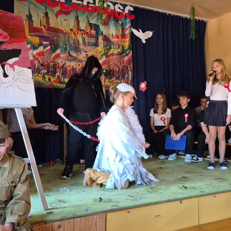 Z okazji Narodowego Święta Niepodległości pani Bernaś wraz z uczniami klasy siódmej oraz solistkami chóru Perfectum przygotowała piękną i wzruszającą akademię.