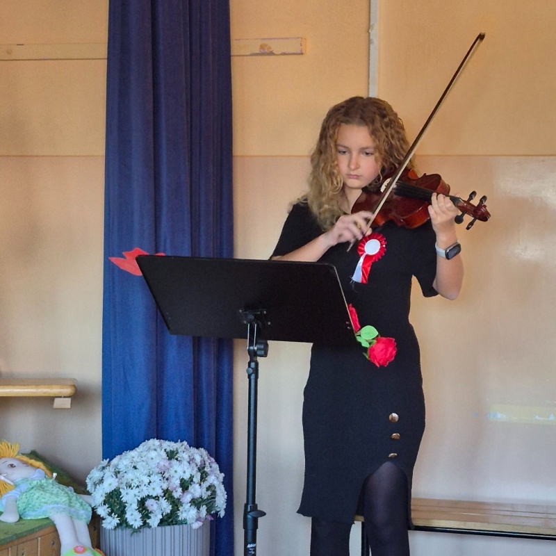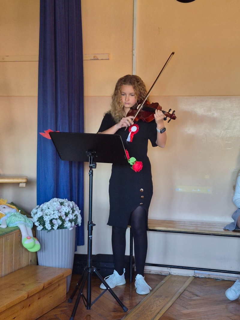 Podczas uroczystości przypomniano trudną drogę Polski do wolności – lata niewoli, walki, powstań i ofiarę wielu pokoleń, które nie traciły wiary w niepodległą ojczyznę. Wspólnie wysłuchaliśmy pieśni patriotycznych, a szczególne wzruszenie wywołała „Rota”, która zabrzmiała w wyjątkowym wykonaniu na altówce.