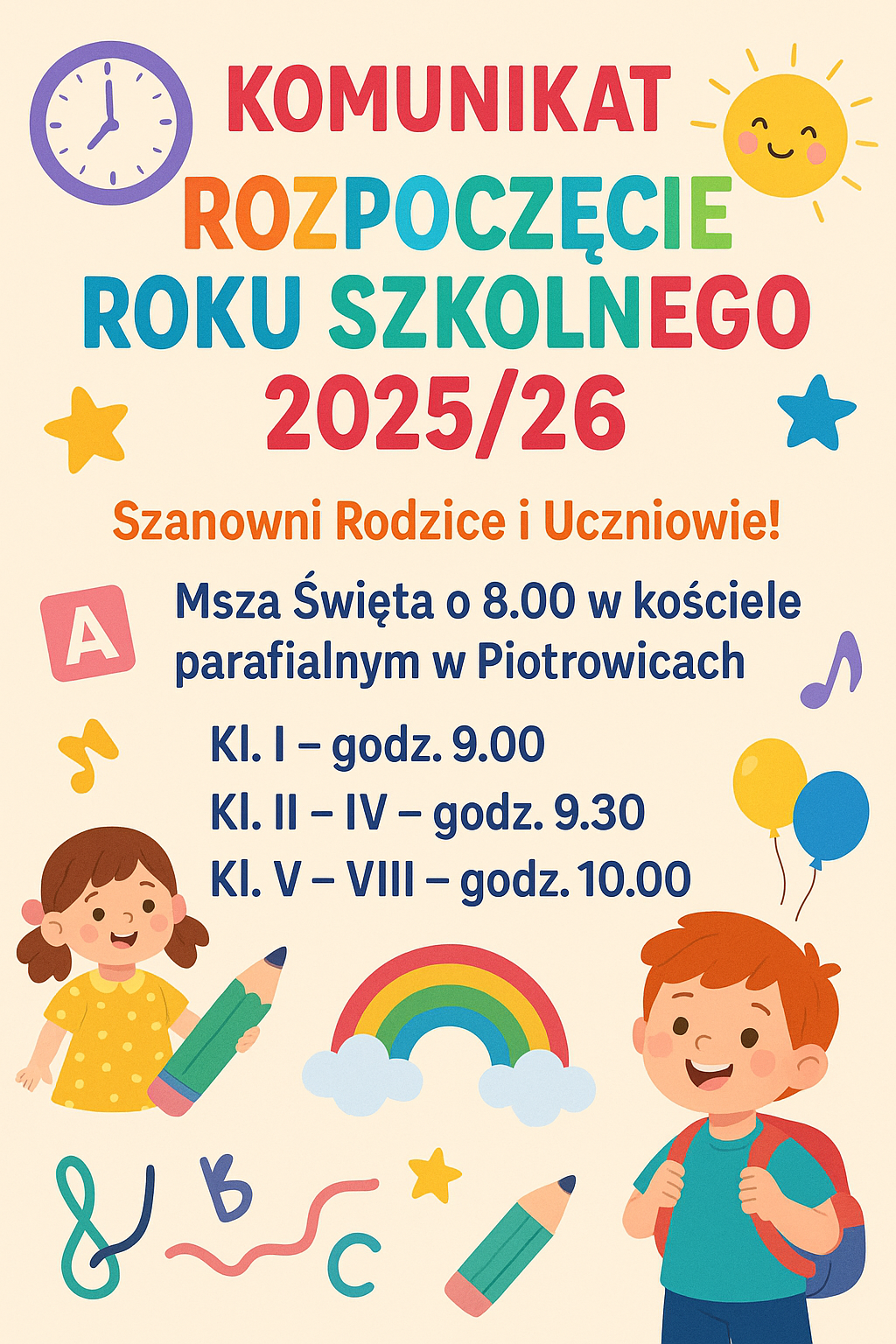 Informujemy, ze rozpoczęcie roku szkolnego 2025/26 odbędzie się w poniedziałek, 1 września 2025, wg następującego harmonogramu: