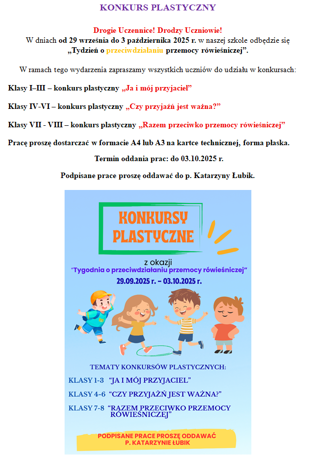 Konkursy plastyczne w ramach "Tygodnia o przeciwdziałaniu przemocy rówieśniczej".