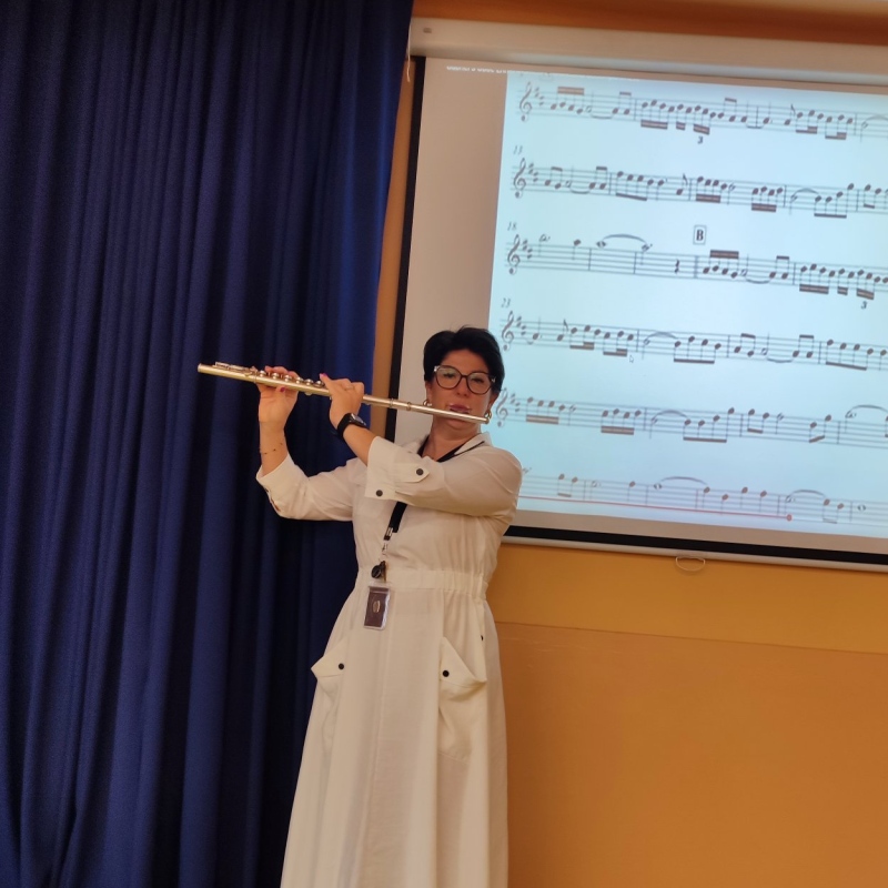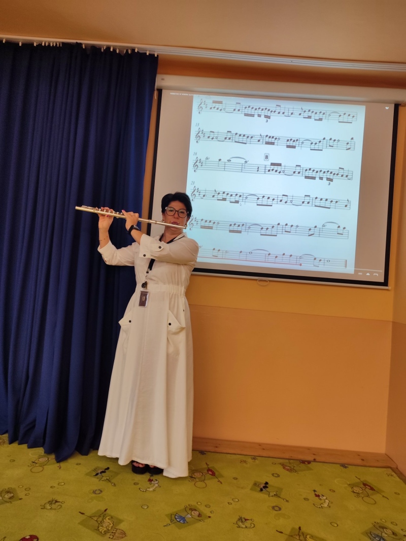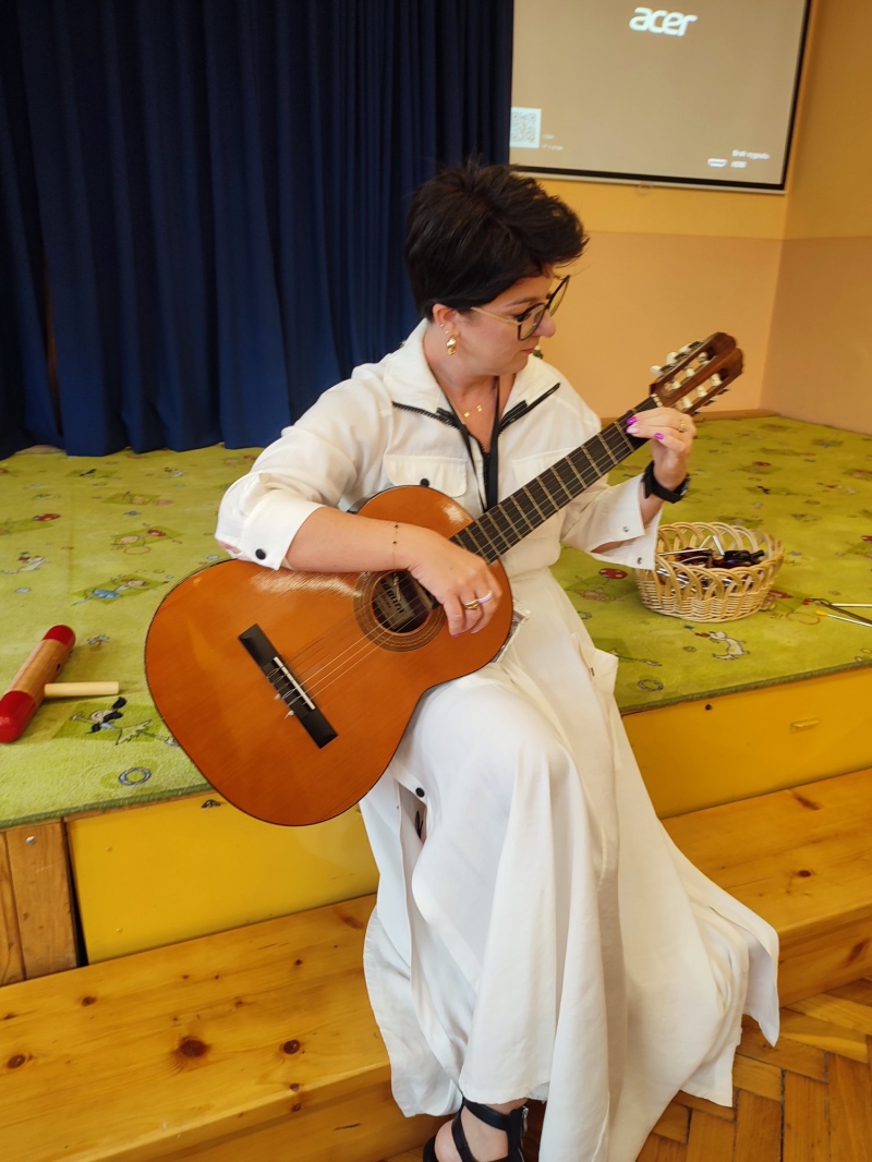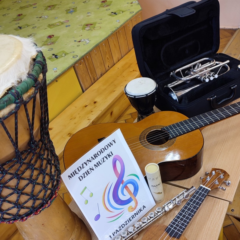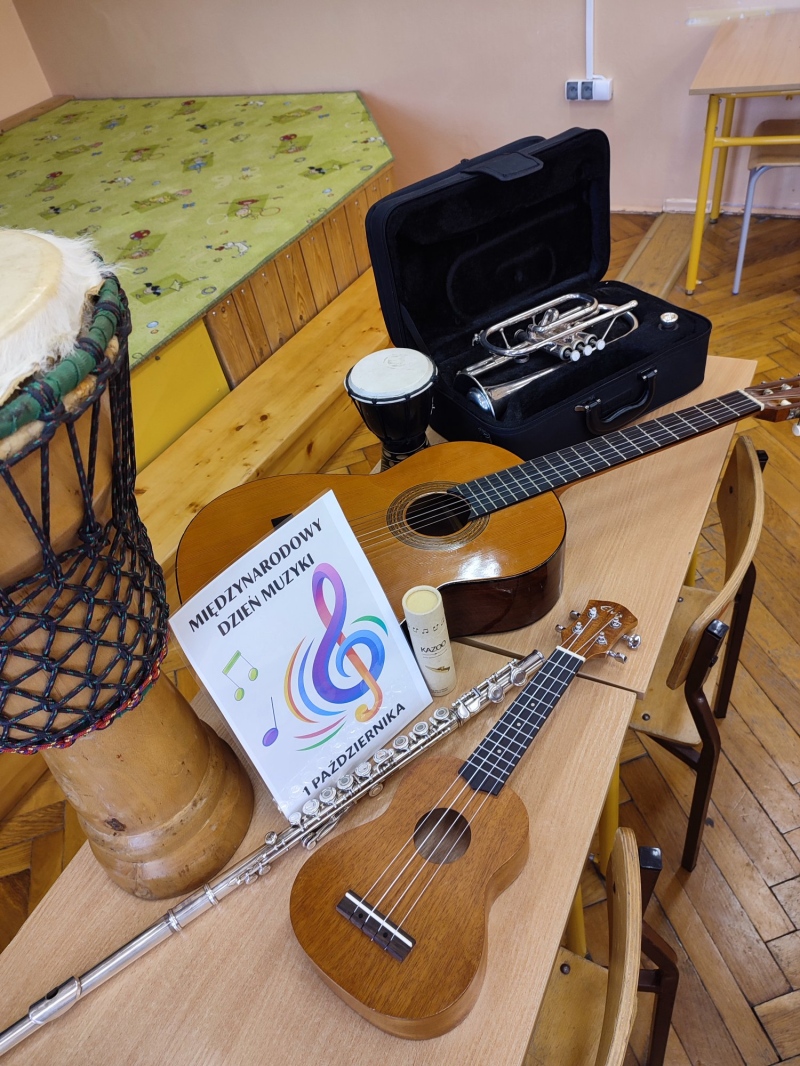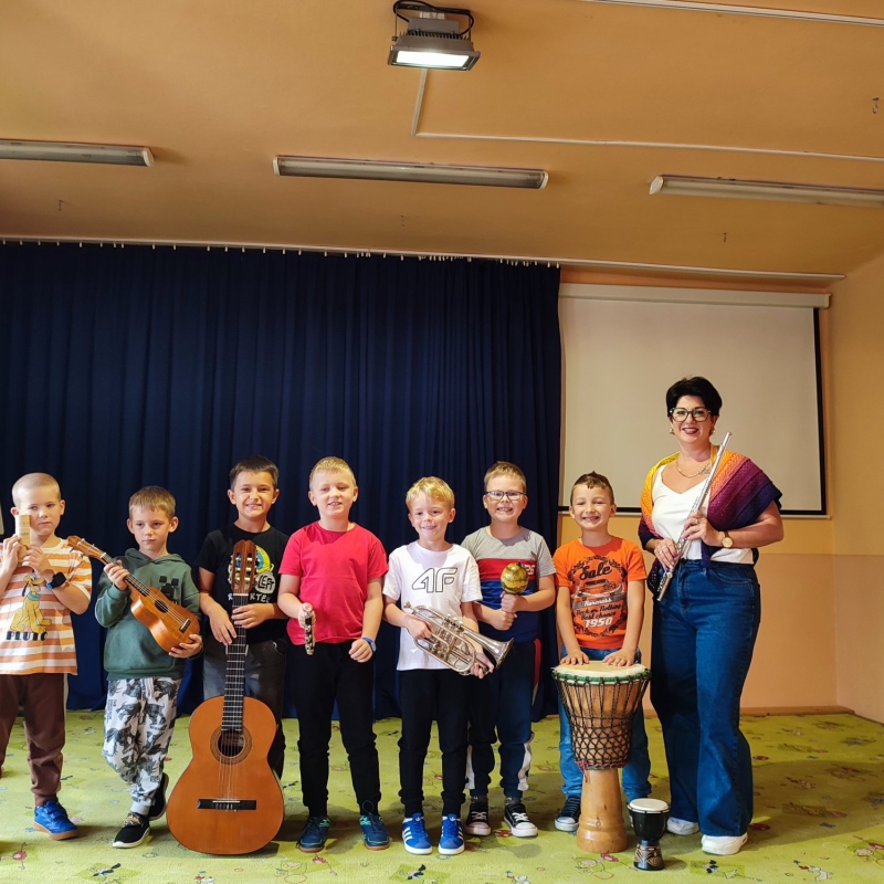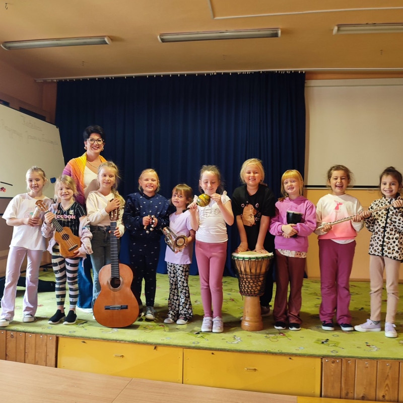 Nie zabrakło również muzyki klasycznej – uczniowie wysłuchali utworów wykonanych na flecie poprzecznym oraz mieli okazję z bliska zobaczyć i dotknąć trąbki-kornetu. Dzień ten był pełen rytmu – wszyscy uczniowie wspólnie grali na instrumentach perkusyjnych, tworząc niezwykłą orkiestrę! Po raz pierwszy dzieci poznały djembe – bęben z serca Afryki. Djembe to tradycyjny, ręcznie robiony bęben pochodzący z Afryki Zachodniej. Wykonany jest najczęściej z jednego kawałka wydrążonego drewna, a membrana naciągnięta na jego górze to zazwyczaj naturalna skóra, najczęściej kozia. Ma charakterystyczny kształt kielicha, dzięki czemu wydaje głębokie, donośne dźwięki. Gra się na nim dłońmi, bez użycia pałeczek. W zależności od sposobu uderzenia, można uzyskać różne dźwięki: od niskich, basowych tonów po wysokie i ostre brzmienia. Djembe jest bardzo uniwersalnym instrumentem – można na nim grać solo, w grupie, improwizować rytmy albo odtwarzać tradycyjne afrykańskie melodie.