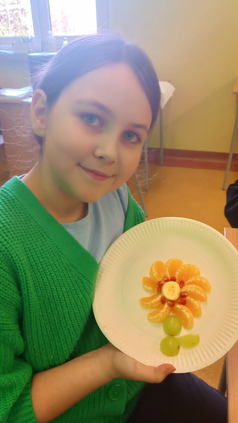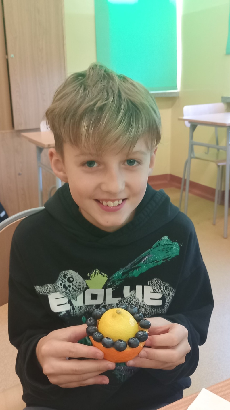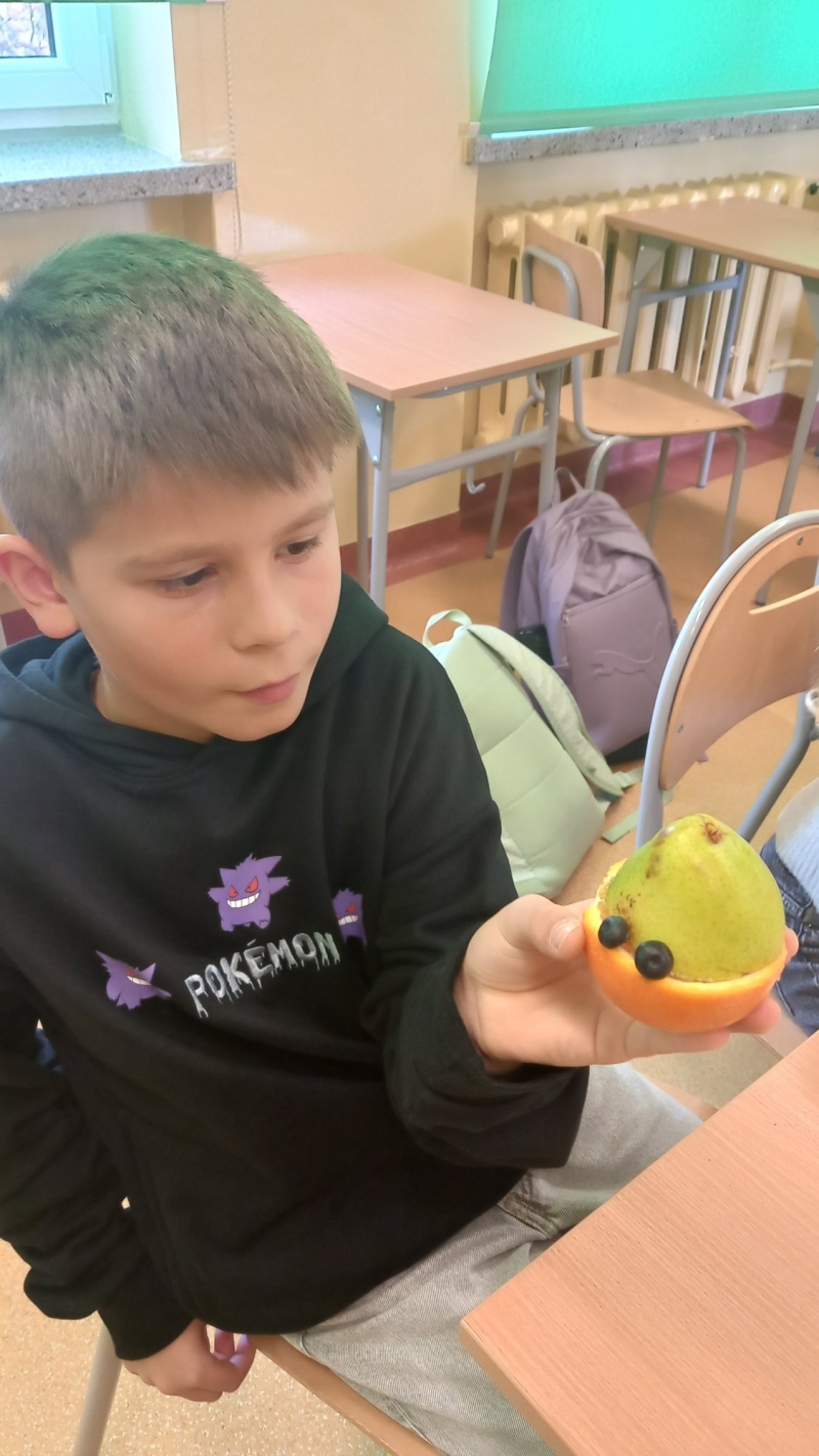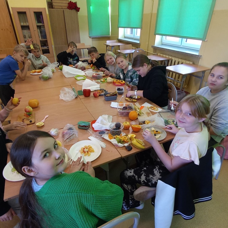 Po lekcji wychowawczej związanej z mocami, które dają nam owoce i warzywa. w zależności od swoich kolorów, przyszedł czas na działania praktyczne - przygotowanie barwnej i zarazem zdrowej kompozycji warzywno- owocowej, a następnie jej skonsumowanie w miłym towarzystwie. Jak połączyć rozwój wyobraźni, zdrowe ciało, współpracę i dobrą zabawę? Oto pomysły uczniów.