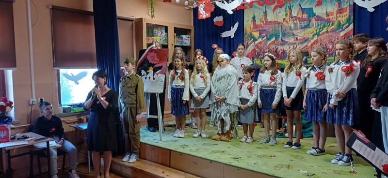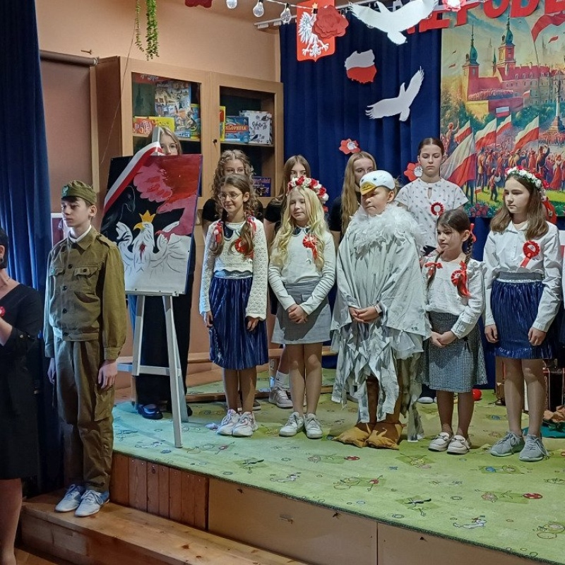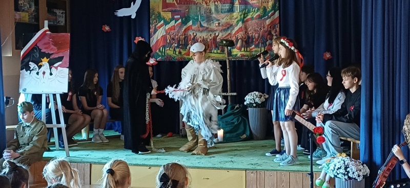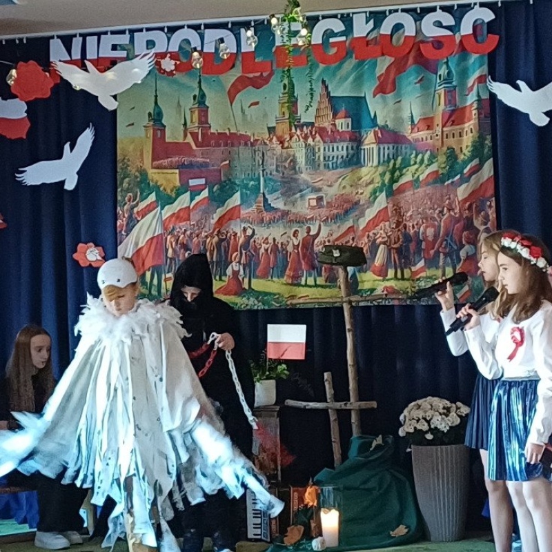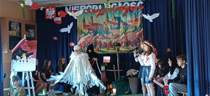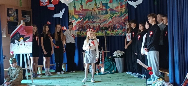 Z okazji Narodowego Święta Niepodległości pani Bernaś wraz z uczniami klasy siódmej oraz solistkami chóru Perfectum przygotowała piękną i wzruszającą akademię.