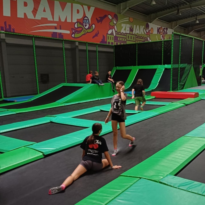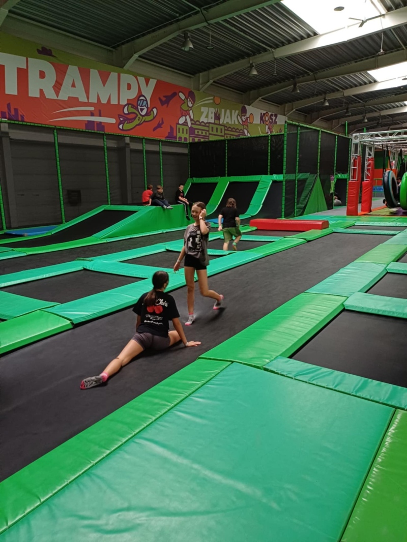 Po wejściu do środka wszystkim od razu zaświeciły się oczy – ogromna przestrzeń pełna trampolin, basenów z gąbkami, torów przeszkód i areny do gier. Po krótkiej rozgrzewce i instruktażu mogliśmy rzucić się w wir skakania.
