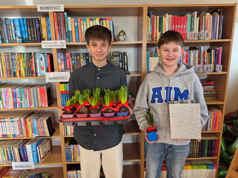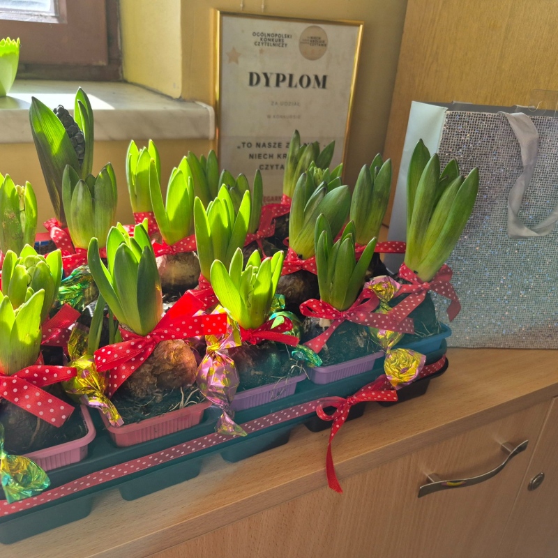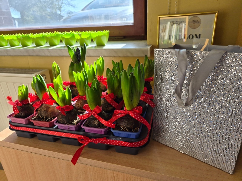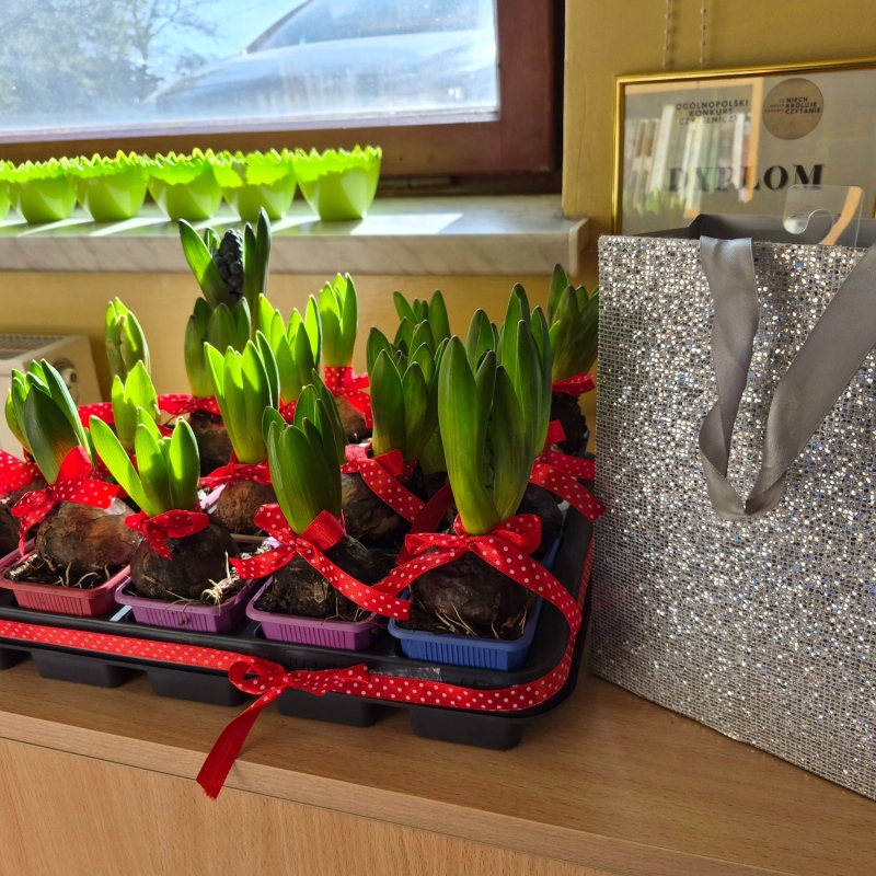 Pachnący hiacynt: Każda z pań otrzymała kwiat hiacynta w doniczce, który jest symbolem odradzającej się natury. To trwały prezent, który jeszcze przez wiele dni będzie ozdabiał szkolne biurka i parapety.
