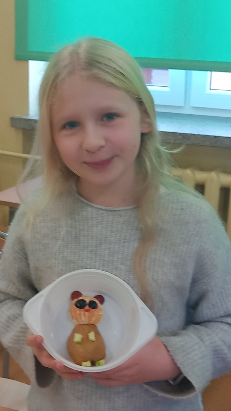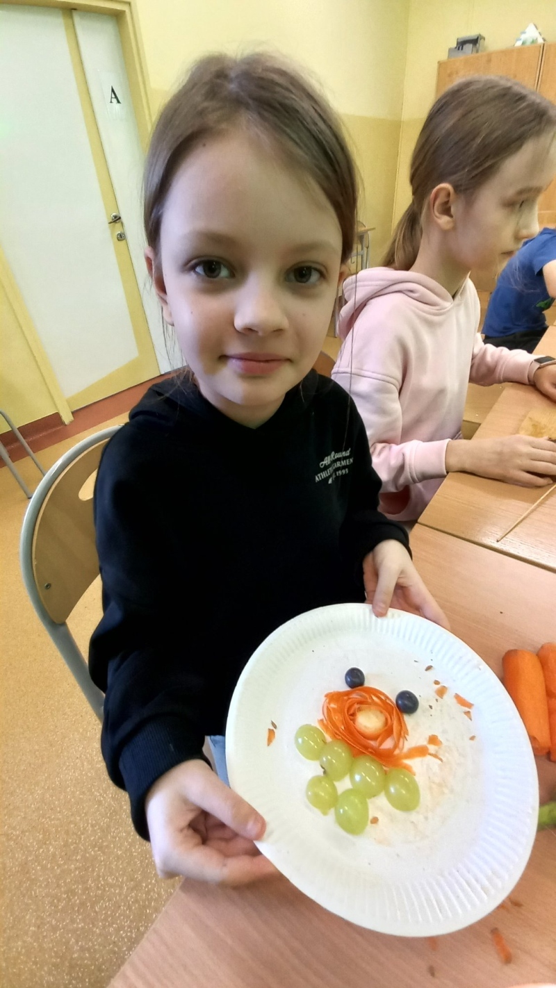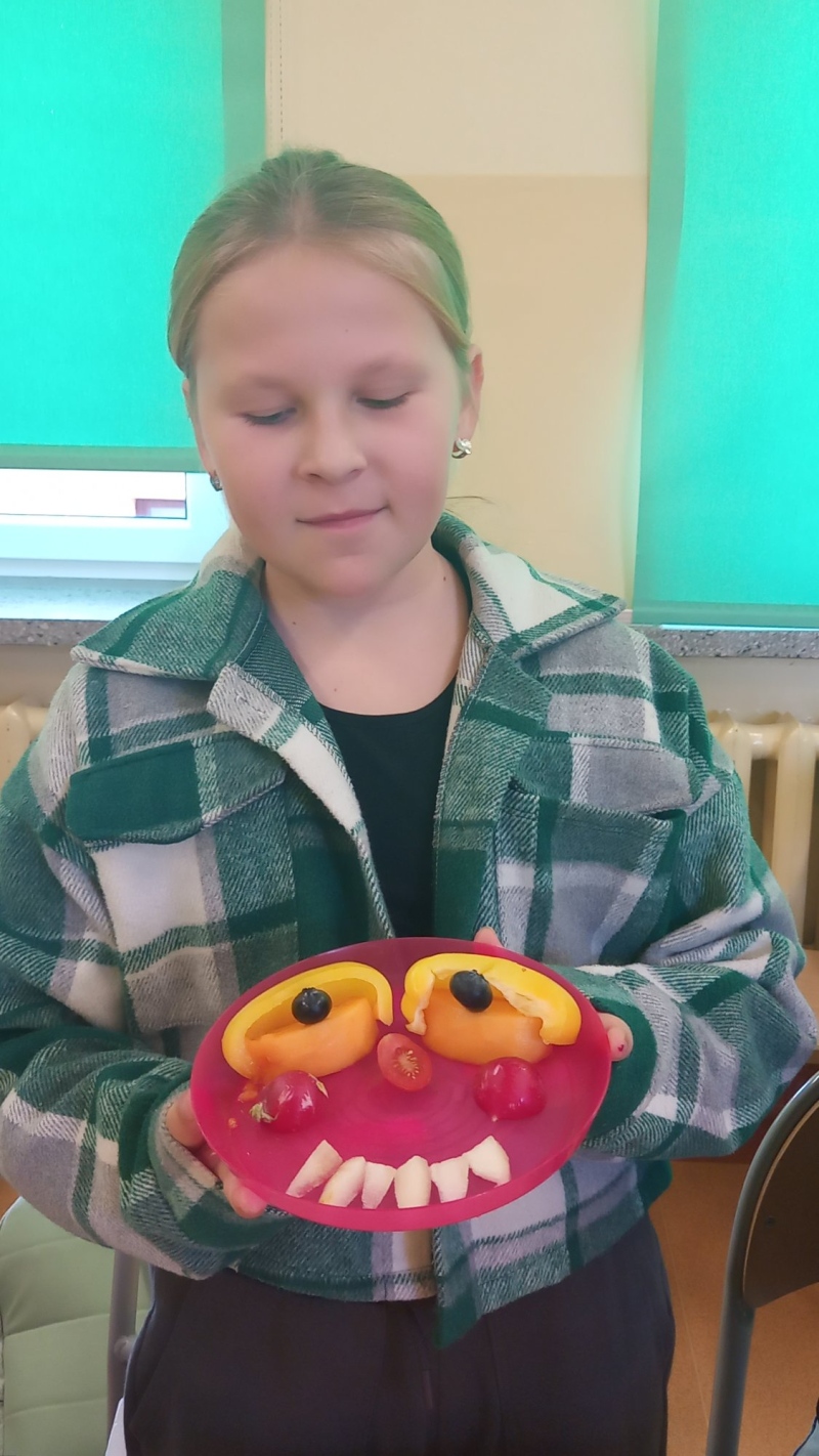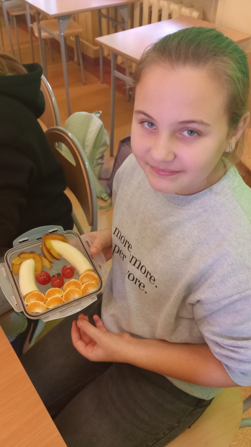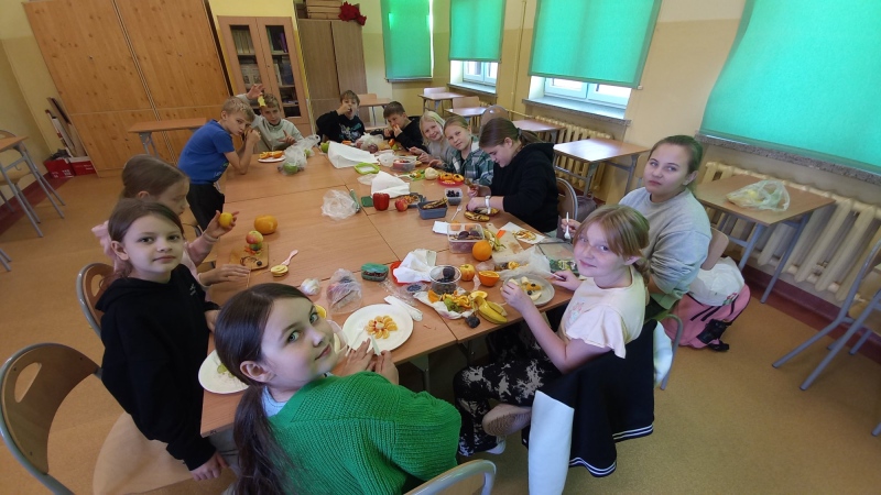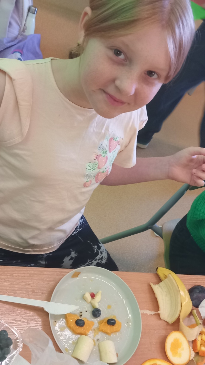 Po lekcji wychowawczej związanej z mocami, które dają nam owoce i warzywa. w zależności od swoich kolorów, przyszedł czas na działania praktyczne - przygotowanie barwnej i zarazem zdrowej kompozycji warzywno- owocowej, a następnie jej skonsumowanie w miłym towarzystwie. Jak połączyć rozwój wyobraźni, zdrowe ciało, współpracę i dobrą zabawę? Oto pomysły uczniów.