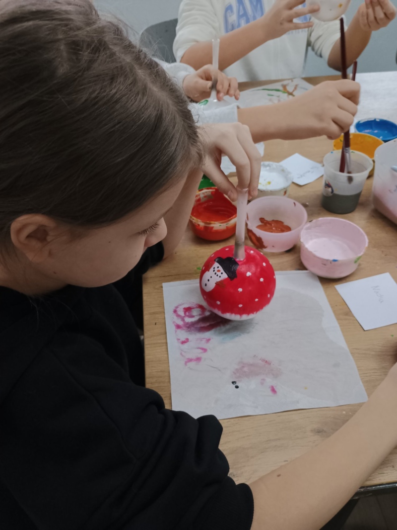 Największą atrakcją były warsztaty plastyczne, podczas których każdy samodzielnie malował bombkę według własnego pomysłu. Gotowe ozdoby stały się nie tylko piękną dekoracją domowej choinki, ale także wspaniałą pamiątką.